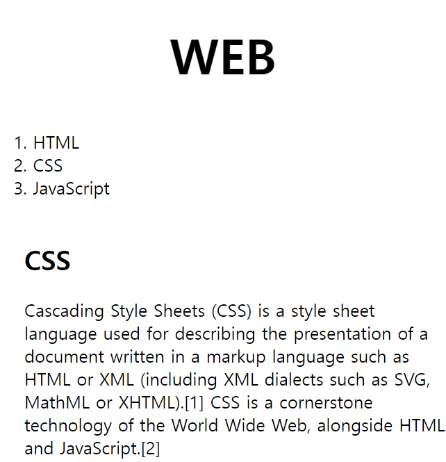 - <h1>, <a> 태그는 각각 WEB이라는 문자가 링크, 제목임을 설명하는 "정보"임에 반해, <font> 태그는 "디자인" 기능을 할 뿐 어떠한 정보도 가지고 있지 않다. 따라서 웹페이지가 정보로서의 가치가 떨어지는 문제가 생기게 된다.